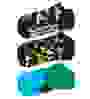 Ein weißes, grünes und schwarzes Happy Socks Geschenk-Set mit dem Namen „Sneaker“ liegt auf einem blauen Boden mit einem weißen Streifen in der Mitte, der an ein Stadion erinnert.
