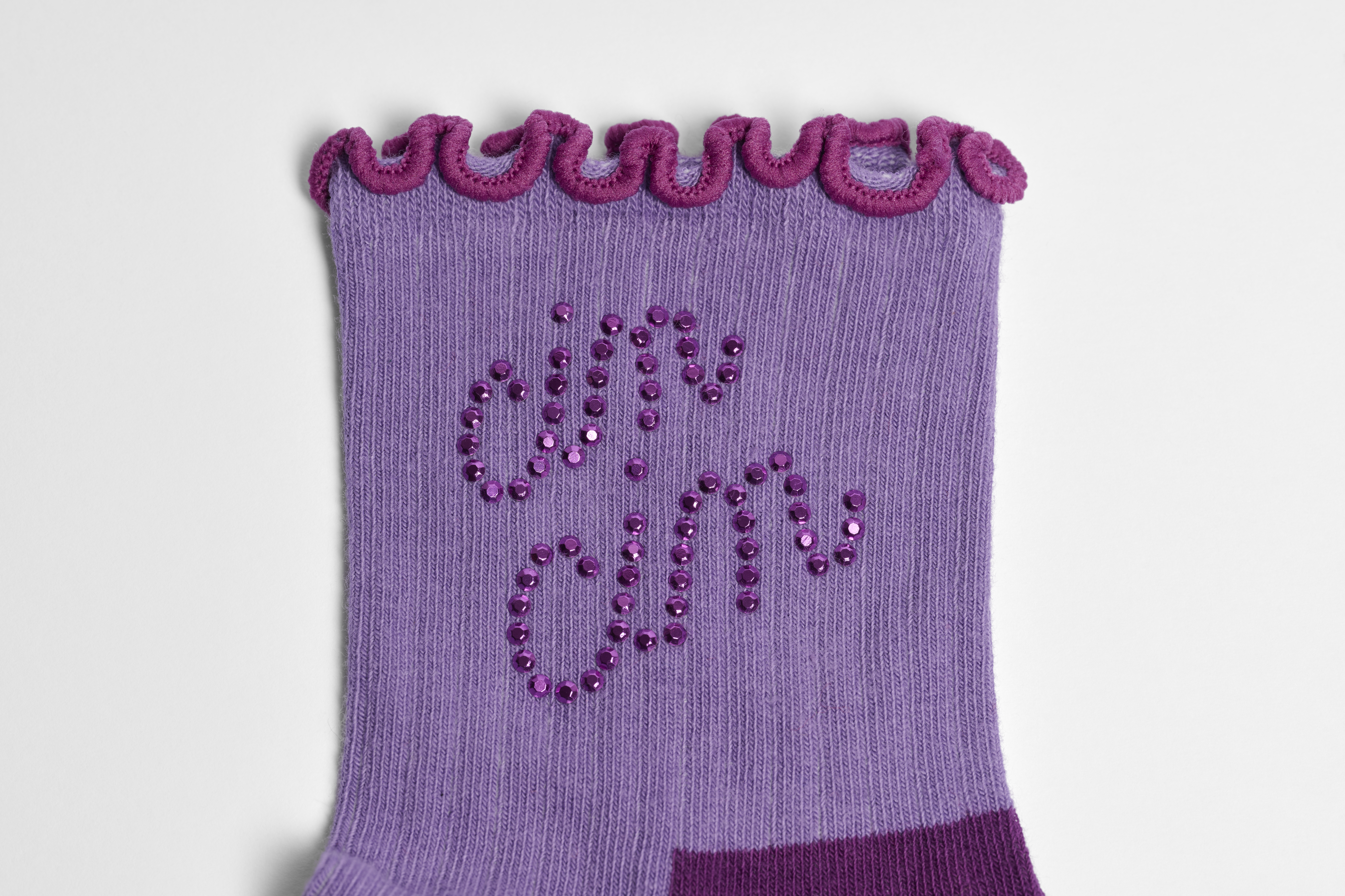 Add a touch of glamour to your outfit with our Cin Cin Mini Crew Sock. This purple mini crew sock is adorned with the phrase "Cin Cin" in dazzling rhinestones near the cuff, adding a dash of sophistication to any look. The ruffle cuff adds a playful touch, making these socks perfect for those who like to make a statement. We're all about authentic self-expression. Whether you're toasting to a special occasion or just want to add some sparkle to your day, these funky socks are sure to bring a smile to your face. Perfect gift for: wine lovers with a sense of humor.