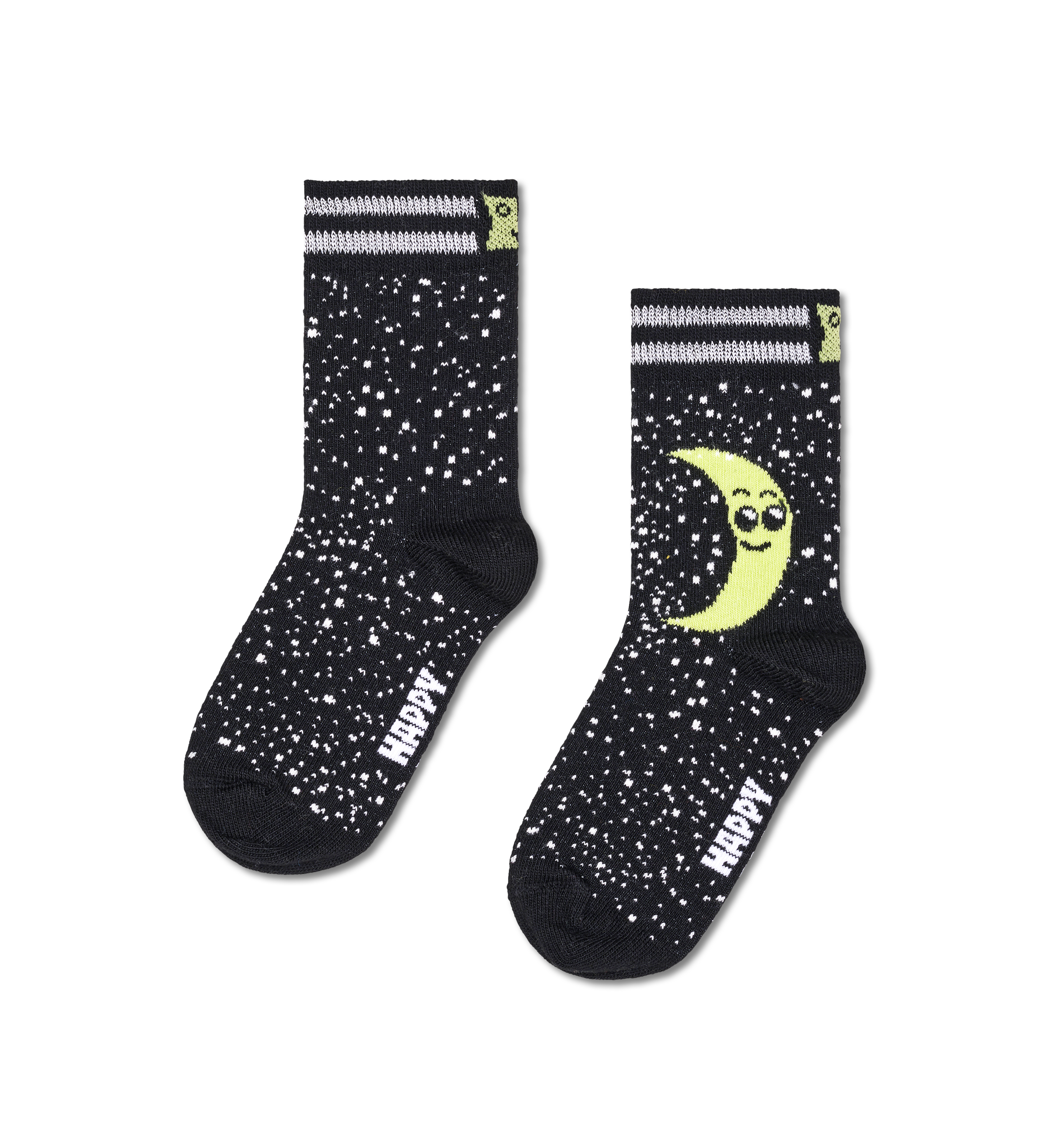 Keep little toes snug all through the day and night with these cute half-moon socks. Naturally, the stripes glow in the dark! Made from organic combed cotton and recycled polyamide with reinforced toe and heel. Also comes with a nifty name tag so it's easy to keep track of the socks. Soft, gentle, and full of charm, the Kids Half Moon Sock is a delightful addition to any little one's wardrobe. The adorable half-moon design shines bright with a special glow-in-the-dark feature, adding an extra layer of magic to bedtime and nighttime adventures. With a sweet, subtle pattern, these kids socks are perfect for everyday wear, and their comfortable design ensures happy feet all day long. The Kids Half Moon Sock is a thoughtful way to keep tiny toes cozy and stylish. Perfect gift for: little stargazers and sleepyheads.